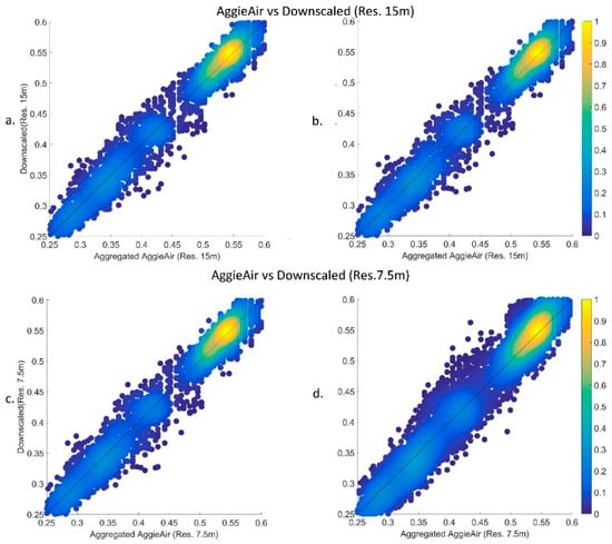 Pixel-wise comparison of AggieAir imagery versus downscaled NIR images as at resolution 15 and 7.5 m for the first (a,c) and second (b,d) scenarios, respectively.