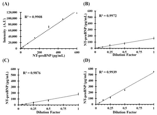 (A) Standard curve, (B–D) depict the linearity of the test in clinical samples containing 162 pg/mL, 183.3 pg/mL, and 551.9 pg/mL of NT-proBNP after spiking, respectively.
