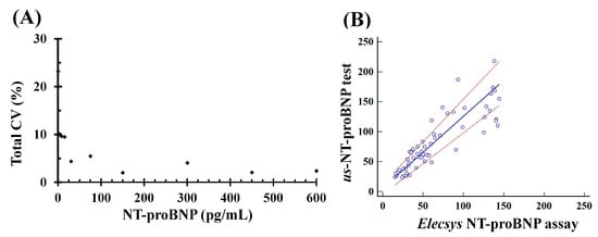 (A) Inter-assay precision profiles for the us-NT-proBNP test; (B) Passing and Bablok regression analyses of results for 58 clinical samples (range: 26.3–163.3 pg/mL) by us-NT-proBNP test and NT-proBNP assay.