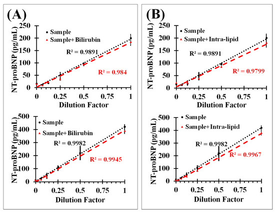 The interference from endogenous constituents such as bilirubin, intra-lipid, hemoglobin, and biotin in plasma has been reported in immunoassays used for the detection of NT-proBNP [39,40]. Therefore, to determine the interference of these materials in us-NT-proBNP test, plasma samples were spiked separately with bilirubin (0.2 mg/mL), intra-lipid (0.2%), hemoglobin (1 mg/mL) and biotin (30 ng/mL). Figure 3A,B demonstrate the results for samples containing 200 pg/mL and 420 pg/mL of NT-proBNP mixed with the bilirubin and intra-lipid. A serial dilution test by us-NT-proBNP test was also performed on the samples in presence and absence of bilirubin and intra-lipid. The similarity in the correlation coefficient values, which were higher than 0.984, in presence and absence of interfering materials clearly indicate that us-NT-proBNP test does not have any interference from bilirubin, intra-lipid, and any other endogenous constituents in the tested samples.