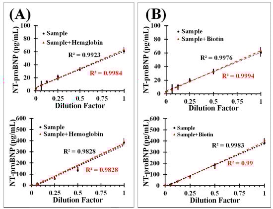 Figure 4A,B demonstrates the results for samples containing 60 pg/mL and 400 pg/mL of NT-proBNP mixed with the hemoglobin and biotin. A serial dilution test of these samples in the presence and absence of hemoglobin and biotin allowed measuring the effect of these interfering materials on us-NT-proBNP test. The correlation coefficient values, which were higher than 0.982, indicate that hemoglobin and biotin do not have any effect on the performance of us-NT-proBNP test.
