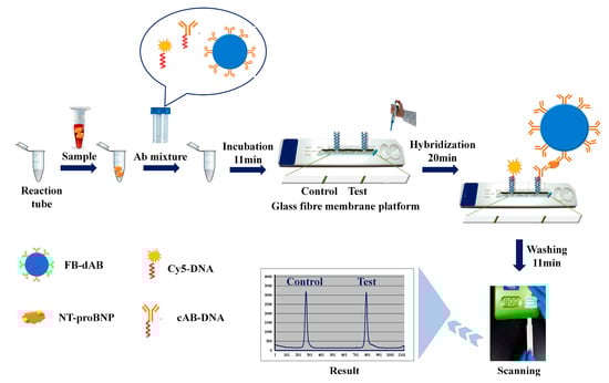 As depicted in Scheme 1, us-NT-proBNP test allows the quantification of NT-proBNP in clinical samples with a simple and rapid process. In brief, us-NT-proBNP test is performed as follows. 10 µL of a sample was transferred into a reaction tube and then 100 µL of antibody mixture (kept under thermal control at 25 °C for 10 min) containing capture antibody-DNA (cAb-DNA) conjugate, Fluorescent bead labeled detection antibody (FB-dAB) was added. This solution was incubated in homogeneous phase for 11 min. A biomolecular complex containing NT-proBNP (FB-dAB-NT-proBNP-cAb-DNA) is formed in the solution during the incubation step. After incubation, 60 µL of reaction buffer was added to the reaction tube. The whole reaction mixture is transferred to the sample loading port of the lateral flow membrane test strip (LFMTS), where biomolecular complexes are captured on the test line by DNA-DNA hybridization of immobilized DNA probes and a DNA in the FB-dAB-NT-proBNP-cAb-DNA. The Cy5-DNA hybridizes with the immobilized probes on the control line. After 20 min hybridization, the unbound biomolecular complexes and other components were removed by loading the 170 µL washing solution in the washing port of LFMTS. After the washing step, the LFMTS were scanned in the BMT Reader™ (Biometrix Technology Inc. Chuncheon, South Korea) to obtain the results. BMT Reader™ is a lightweight, portable device that measures fluorescence signals. Every step of the experiment is performed at a room temperature. NT-proBNP concentrations in the clinical samples (measurements in triplicate) were compared with the results of Elecsys® NT-proBNP assay.