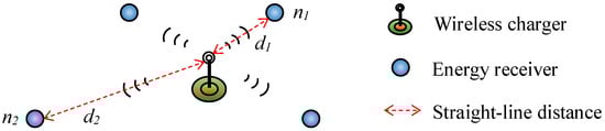 Since the charging efficiency is inversely proportional to the square of distance d from the wireless charger to the energy receiver [], the same amount of energy consumption in different nodes will lead to different burdens on the wireless charger. Investigate nodes and in Figure 1, which each have a distance of and from the wireless charger, respectively. When consumes 1 unit energy, the wireless charger should provide energy to supplement the consumption. However, for node , there is . Supposing that , then is approximately 4 times of . Consequently, the energy saving problem in WRSNs is more complicated than normal WSNs. Traditional energy saving schemes in normal WSNs cannot be directly transplanted into WRSNs.