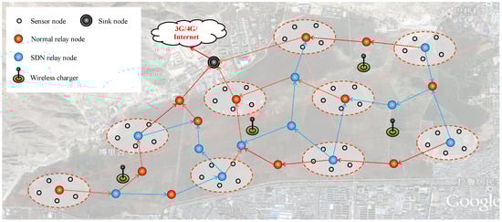 As shown in Figure 2, this paper considers a typical kind of hybrid SDWRSN, where four kinds of nodes are included: sensor nodes, relay nodes, a sink node and some wireless chargers. The sensor nodes collect required information according to some predefined period or discipline, and transmit them to the sink node via some relay nodes. The sensor nodes are dispersedly deployed over the target monitoring area. A certain amount of sensor nodes close to each other form a cluster. Each cluster has a cluster head, which can be dynamically selected by currently existing schemes. The cluster heads can relay data from the cluster it belongs to, as well as data from another cluster head. Therefore, in this paper, we also refer to cluster head as relay node for simplicity.