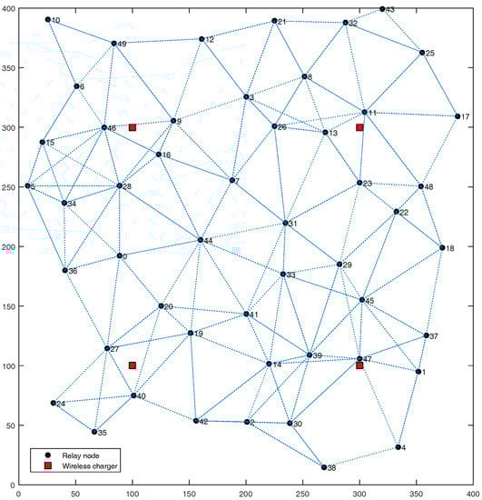 In this section, we evaluate the performance of ETS algorithm via simulations implemented by C++. To ensure the generality of the simulation results, we randomly generate a network as shown in Figure 3, and set the network parameters according to literature [], as depicted in Table 1. The network includes 50 relay nodes randomly distributed, nearly half of them are selected as cluster heads of the corresponding clusters, which are not pictured out for clearness in Figure 3. Four wireless chargers are deployed uniformity in the target area, which are represented by red squares. Two nodes that can directly communicate with a wireless channel are linked with an imaginary line. Like many works such as [,], a simplified model is considered in this paper for communications energy consumption in consideration of path losses. Both the free space ( power loss) and multipath fading ( power loss) channel models are employed, depending on the distance between the transmitter and receiver. Power control can be used to compensate for this loss. If the distance is less than a threshold , the free space model is used; otherwise, the multipath model is adopted. The performance is compared with the MTE algorithm, which has been enhanced for hybrid SDWRSNs.