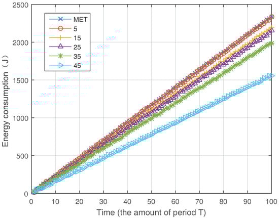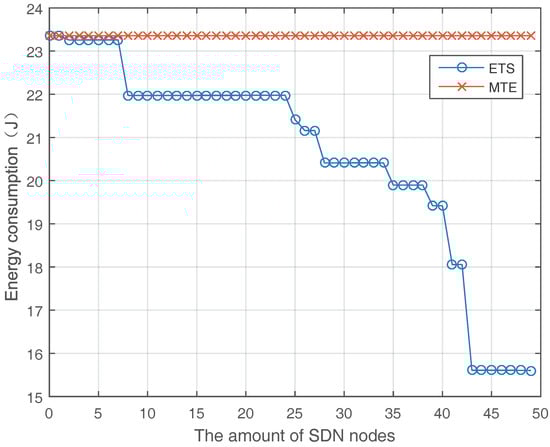 Figure 4 shows the tendency of energy consumption when the amount of SDN nodes increases. Obviously, the energy consumption of ETS algorithm declines with the increasing of SDN nodes and improve the energy efficiency for up to 20–40% comparing with MTE algorithm. This is because that more SDN nodes in the network can provide higher traffic scheduling ability to save more energy. Investigating Figure 4, we can find sometimes that the amount of increase of SDN nodes does not directly lead to reduction in energy consumption, e.g., from eight SDN nodes to 24 SDN nodes. There are three reasons for this phenomenon. Firstly, the new SDN node may not be the first SDN node on the MTE route of a flow and the ETS algorithm only schedules the flow at the first SDN node. Secondly, the new SDN node is the first SDN node on an MTE route, but there is only one optional path, and then there is no influence on the result. Thirdly, the new SDN node is the first SDN node and there are multiple optional paths, but the optional path chosen is the same as MTE route, which results in the same energy consumption as before. To show this tendency more clearly, we demonstrate the energy consumption in 100 periods when different amounts of SDN nodes are employed in Figure 5.