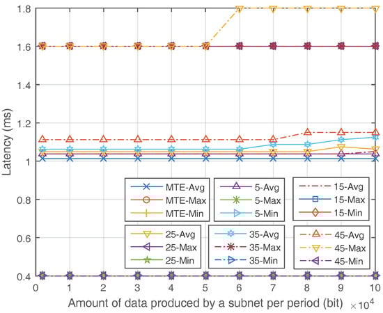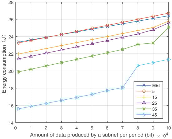 Figure 6 shows the influence of network load on the energy consumption. We measure the energy consumption with the increasing of the amount of data produced by a subnet (or cluster) per period. The comparison is implemented among MTE and ETS with a different amount of SDN nodes. In the network with five SDN nodes, the energy consumption of ETS is slightly higher than that of MTE. This is because ETS will alleviate the load of wireless links that exceed the threshold , but MTE does not. Then, when the amount of SDN nodes grows, the ETS algorithm shows an increasingly larger advantage compared with the MTE algorithm.