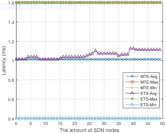 Figure 7 and Figure 8 show the latency of the MTE algorithm and ETS algorithm. In Figure 7, the minimum and maximum latency of ETS are the same as MTE when the amount of SDN nodes grows. The average latency of ETS is slightly higher than MTE when the ratio of SDN nodes is high because the flows may pass a little longer route when they are converged to save energy. Figure 8 shows the relationship between latency and the network load. For ETS, the average latency remains steady when the network load is under a certain threshold, and then grows slightly. In summary, the ETS algorithm do have a little longer average latency compared to the MTE algorithm. However, the increase in latency is so few that it will not influence the quality of service and can be omitted.