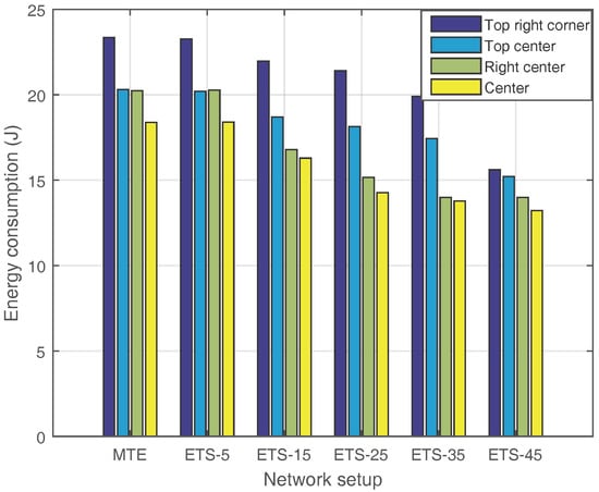 Figure 9 shows the impact of the sink node’s position on the energy consumption. We choose four locations for comparison: top right corner, top center, right corner and center in the network. The MTE algorithm and ETS algorithm with different SDN nodes are all compared. The simulation results show that the location of the sink has a direct impact on the energy saving effect, raising the demand on the optimization of sink node deployment. Considering that this issue has been fully investigated in various WSNs, we can directly adopt current solutions when the ETS algorithm is implemented.