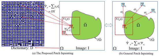 In this subsection, the optimization model of adaptive patch inpainting under the neighborhood-consistency constraint will be put forward, which can yield continuously sharp structures and clearly fine textures that are consistent with the surrounding information. To extend the diversity of the patch , feature dictionary is constructed by the K-SVD algorithm to sparsely represent the missing patch. Feature dictionary is four times redundant in our implementation so that the missing patches can be better inferred. The size of atoms in the dictionary is generally set to pixels or pixels in the paper, which will be specifically discussed in Section 4.