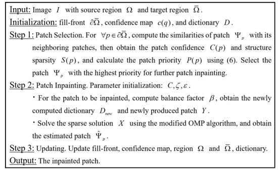 Generally, an image is composed of structures and textured features, where structures constitute the main sketches in the image (e.g., contours and edges) and textures are image regions with similar feature statistics or homogenous patterns (including smooth areas) [26]. The main thought of exemplar-based image inpainting is to inwardly propagate image information from the source regions (i.e., known parts) into the target regions (i.e., missing parts) at the patch level. For each iteration of patch propagation, patch selection and patch inpainting are two primal operations. In patch selection, the patch on the target region boundary with the highest priority is chosen for further inpainting. Patch priority is designed to urge completion of patches located at structures so that structures can be first recovered compared with textured patterns. In the patch inpainting procedure, the chosen patch is synthesized via linear combination of candidate exemplars from the source region [24,25,26].