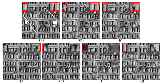 Comparison of Visual Effects on Aerial Image. (a) Corrupted Buildings Image; (b) Our Result Using 16 × 16 Patch; (c) Our Result Using 8 × 8 Patch; (d) Result of [26] Using 16 × 16 pixels Patch; (e) Result of MCA; (f) Result of MRF; (g) Result of Texture Synthesis.