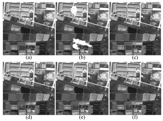 Comparison of Visual Effects on SPOT5 Panchromatic Imagery. (a) Original SPOT5 Image; (b) Corrupted by Simulated Clouds; (c) Result of Proposed Method; (d) Result of MCA; (e) Result of MRF; (f) Result of Exemplar-based.