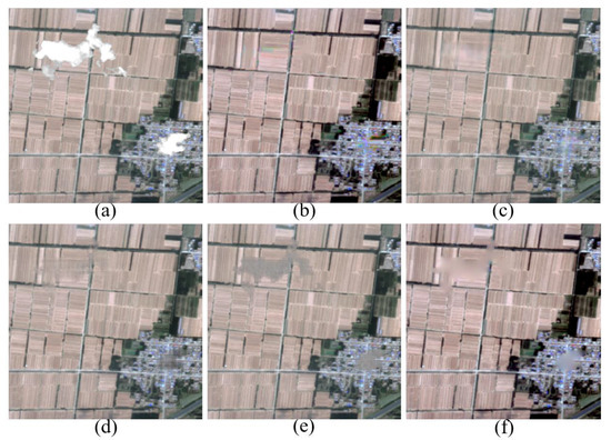 Comparison of Clouds Removal from GaoFen-2 RS Imagery. (a) GaoFen-2 RS Image (true color composites) with Clouds; (b) Cloud Removal by Our Inpainting Method; (c) Cloud Removal by MCA [46]; (d) Cloud Removal by FaLRTC [37]; (e) Cloud Removal by SiLRTC [37]; (f) Cloud Removal by MRF [35].