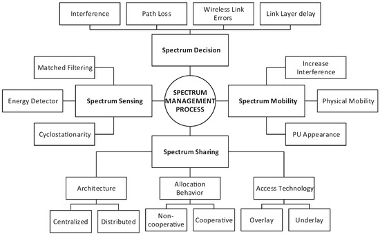 Since there might be different CR nodes attempting to get to the spectrum, the spectrum sharing functionality coordinates CR users’ transmissions to keep different users from crashing in covering parts of the spectrum [53]. Channel allocation does not only depend on spectrum availability, but in order to reduce interference with PU users, it is also determined based on existing spectrum access policies. It also requires at the link layer spectrum awareness together with sensing to achieve an intelligent packet scheduling scheme [54]. As is shown in Figure 2, spectrum sharing can be classified based on different parameters. The spectrum sharing architecture can be categorized into centralized and distributed, where in centralized, the spectrum allocations are controlled by one entity, whereas in the distributed architecture (applied in CRAHN), each individual node can access a spectrum based on a local policy. Spectrum can be allocated cooperatively or non-cooperatively. In cooperative allocation, interference measurement of each node is considered, whereas in the non-cooperative method, only a single node measurement is considered. Based on the access technology, spectrum sharing can be categorized into overlay and underlay spectrum sharing. In the overlay scenario, the unused part of the spectrum is considered for SUs’ transmission, whereas in underlay, SUs transmission is considered as noise for the PUs’ signal.