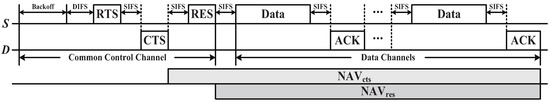 CAD-MAC utilizes the surely understood ON/OFF model to portray PUs’ channel-utilization patterns, and all information channels are grouped into synchronized channel slots. CAD-MAC assumes all of the subsequent nodes in the CRAHN are synchronized and work with the same division of time as that of PUs to productively shield PUs from being meddled by SUs. In the CAD-MAC protocol, node pairs negotiate to access the opportunistic data channels through control packets in the transmission period, which are RTS, CTS and REServation (RES), respectively. As can be seen from Figure 6, after a successful three-way handshake (RTS-CTS-RES), data channels and rates for transmission can be determined. Then, the origin-destination pair can transmit using the selected data channels.