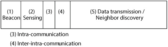 Another distributed multi-channel protocol is Cognitive MAC (C-MAC) [78], which uses multi-transceivers, synchronization and time slots. In this protocol, channels are logically organized into superframes that include a Beacon Period (BP) and a Data Transfer Period (DTP); see Figure 8. To avoid interference, each BP is additionally divided on the basis of time; thus, nodes avoid interference and exchange information by using the negotiation of channel usage.
