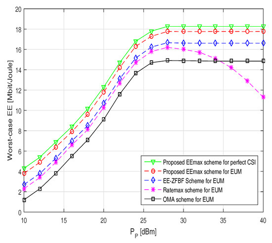 Figure 2 demonstrates the worst-case energy efficiency versus available transmission power at the BS with the fixed circuit power of = 1 W. It can be observed that the proposed EEmax scheme consistently outperforms the Ratemax and OMA scheme in terms of the worst-case EE. It can be noticed that the worst-case EE of the proposed scheme increases until the transmission power reaches 28 dBm and begins to saturate after that level. This can be explained considering that the BS stops consuming more power to transmit the signals when the proposed EEmax scheme achieves the optimal EE for the given convergence criteria. In particular at = 30 dBm, the worst-case EE achieved by the proposed EEmax scheme is 17.6 Mbits/joule compared to 16.5 Mbits/joule by the EE-ZFBF scheme. The worst-case EE for the Ratemax scheme increases until the power reaches 28 dBm and then it begins to decrease, since the scheme emphasis on finding the BF vectors to achieve the high transmission capacity. It is also good to note that the worst-case EE performance of the proposed EEmax scheme for EUM performs close to the case with perfect CSI.