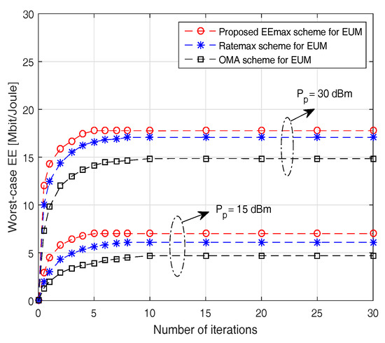 Figure 3 illustrates the worst-case EE versus number of iterations for two different transmission powers at the BS. It can be noticed that the worst-case EE increases monotonically for the proposed EEmax scheme before it converges at around five iterations for both low ( = 15 dBm) and high ( = 30 dBm) transmission power. However, the Ratemax and OMA scheme takes around eight and ten iterations, respectively, for convergence. This is due to the reason that the optimal BF vectors in the proposed JRBEE algorithm are obtained by minimizing the transmission power at the base station. We also note that the proposed EEmax scheme consistently beats the Ratemax scheme in terms of the worst-case EE and the number of iterations to attain convergence.