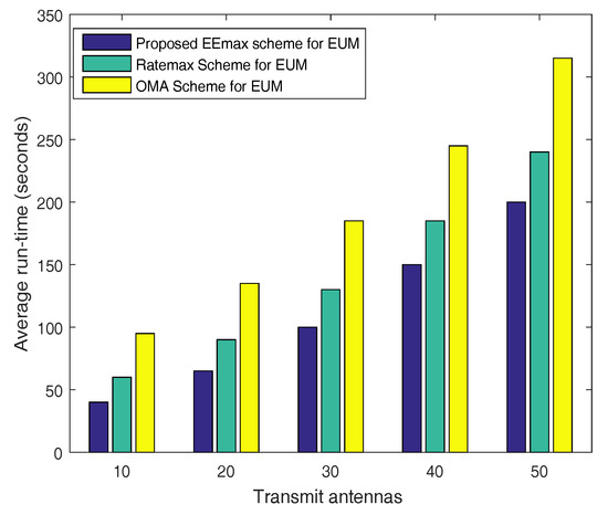 Figure 4 depicts the number of antennas at the transmitter versus an average CPU run time, which helps to determine the implementation complexity of the considered schemes. It can be seen that the proposed EEmax scheme has the least implementation complexity compared to the Ratemax and the OMA scheme. In particular, the average runtime taken by the proposed scheme for 20 antennas is only 65 s, whereas the Ratemax scheme and the OMA scheme takes around 90 s and 135 s, respectively. This observation can be justified for the reason that the proposed user pairing algorithm splits the available users into two groups and search only times to allocate the transmission power for selecting one active user pair. Moreover, the proposed EEmax scheme also avoids the large matrix inversions and complex matrix calculations.