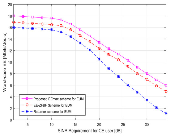 Worst-case EE versus signal-to-interference-plus-noise-power-ratio (SINR) requirement for cell edge (CE) users.