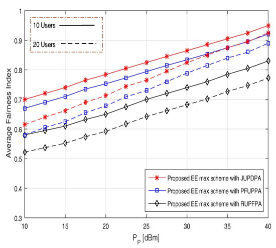 Figure 6 exemplifies the average fairness index versus transmission power at the BS for a different number of users. We compare our proposed JUPDPA algorithm with RUPFPA (random user pairing with FPA) [22] and PFUPPA (proportional fairness based user pairing and PA) [23] algorithm. It can be noticed that the fairness linearly increases with the transmission power with the proposed JUPDPA algorithm providing the best fairness among the considered schemes. In particular, while considering for 10 users at = 25 dBm, the average fairness index is 0.83 for the proposed JUDPA algorithm compared to 0.79 and 0.7 for the PFUPPA and RUPFPA algorithm, respectively. This was expected because the proposed pairing scheme has a significantly greater impact on the achievable rate of the CE users, which, in turn, helps to increase the fairness between the users. Moreover, it is good to note that the average fairness index is reduced for a large number of users due to increase in the IUI.