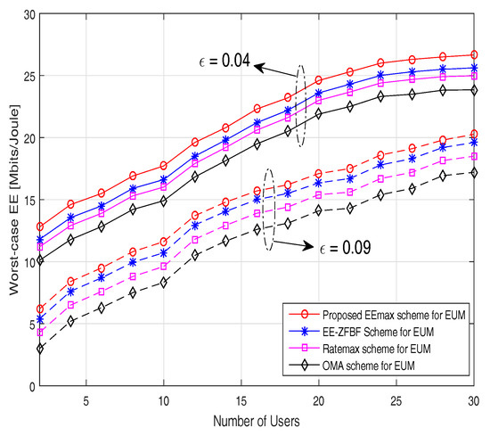 In Figure 7, the worst-case energy efficiency is evaluated versus the number of users for different channel uncertainty values. It can be noticed that when the number of users increases, the worst-case energy efficiency also increases only until all the users needs can be satisfied by the total available power at the BS. Once it exceeds that limit, then the worst-case EE will start to decrease. Worst-case EE attained by the proposed EEmax scheme decreases with an increase of channel uncertainty as expected. Our proposed EEmax scheme again achieves better performance than the other considered schemes. In particular, at = 0.09 for 10 users, the worst-case energy efficiency for the proposed EEmax scheme is 11.5 Mbits/joule compared to 8.5 Mbits/joule attained by the OMA scheme. This can be justified by the fact that the conventional OMA scheme does not fully utilize the available spectrum and energy resources compared to NOMA scheme where a greater number of users can be served simultaneously by the power domain multiplexing.
