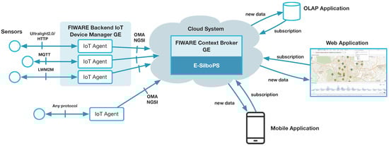 By using this architecture, as shown in Figure 1, IoT devices will be represented in a FIWARE platform as NGSI entities in the Context Broker. This means that you can query or subscribe to changes of device parameters status by querying or subscribing to the corresponding NGSI entity attributes at the Context Broker. E-SilboPS represents a key internal platform asset to achieve elasticity in the distribution of context information mediated by the Context Broker in a cloud-enabled environment.