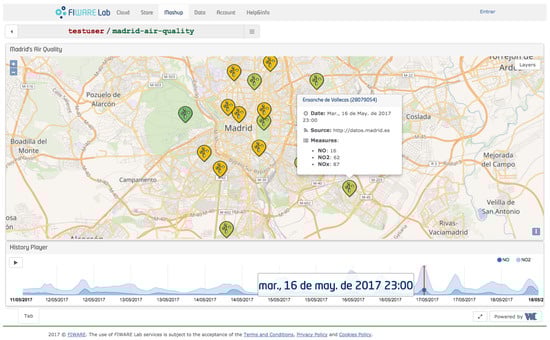 - Mashup FIWARE Lab: Madrid Air Quality. Available online: https://mashup.lab.fiware.org/testuser/madrid-air-quality (accessed on 6 September 2017).