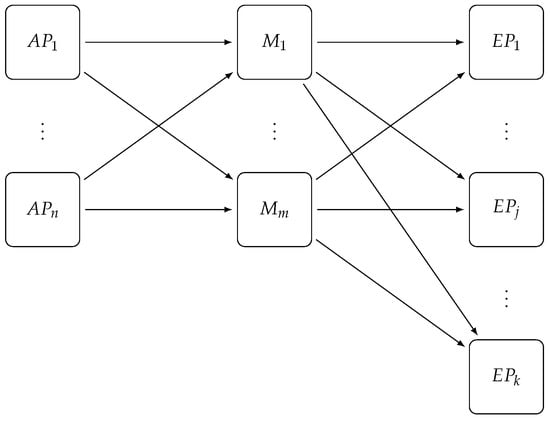 E-SilboPS architecture for the all layers: Connection Point, Access Point, Matcher and Exit Point. Notifications and subscriptions are coming from the Connection Point layer to the Access Point layer in order to be dispatched to the correct Matcher layer instance (⋯) and then it will be sent to a specific Exit Point instance to collect all responses and avoid message duplication. Finally, the message will be sent to the selected Connection Point to be delivered to clients. In this figure, the Distributed Coordinator, since it has a direct connection to each slice of each layer, has been omitted in order to keep the diagram clean.