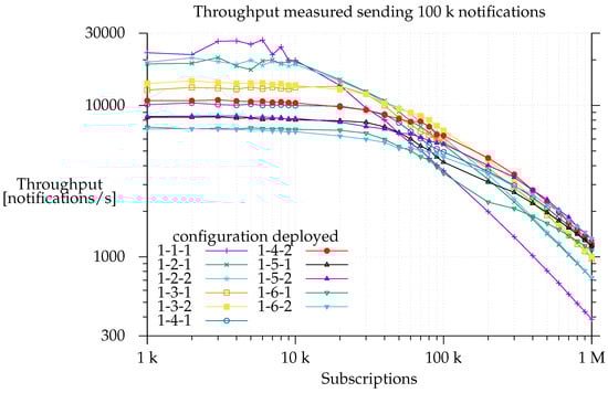 This is a worst-case scenario setup since the system has to deliver all the notifications, whereas, in a real environment, some notifications will not be delivered because no matching subscriptions will have been sent. As shown in Figure 7, when E-SilboPS was deployed with a 1-1-1 configuration, notification throughput started to slow down just after the system was loaded with 10 k subscriptions. It descended at a constant rate, and processing time started to be dominated by matching as of 20 k subscriptions. This means that the constant throughput on the left side of the graph is due to network saturation. This limits the amount of messages that an operator can process [].