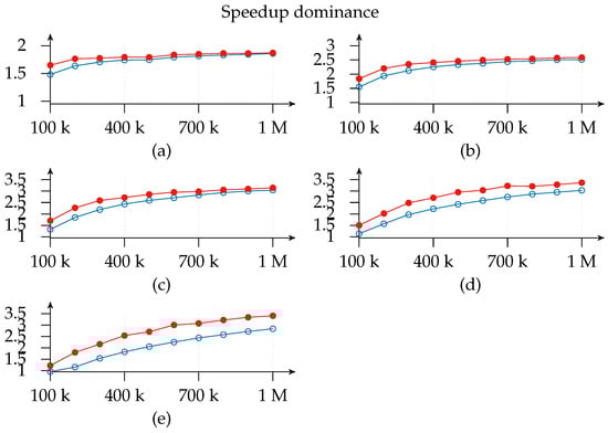 Notification throughput speedup dominance of 1-x-2 over 1-x-1: the line with filled circles plots the speedup for the 1-x-2 configuration, whereas the line with empty circles plots the speedup for the 1-x-1 configuration; plots (a–e) represent matcher instances, namely x, scaling from 2 to 6.