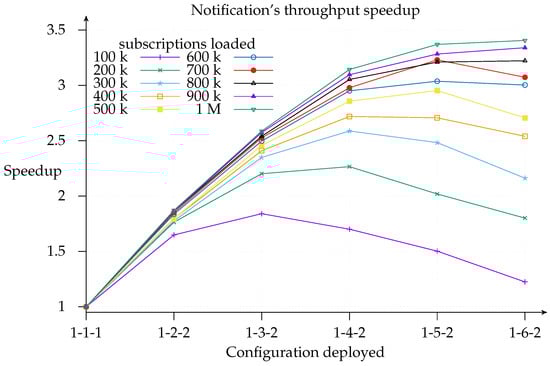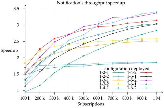 Finally, note for Figure 7 that, on the far right, the speedup gained by adding more and more matchers is downward, which is sub-linear. This applies to total efficiency, as shown in Figure 9, Figure 10 and Figure 11 too. This is consistent with Amdahl’s law, Gustafson’s law [,] and Eager []. Even so, the notification throughput provided using the 1-6-2 was 3.4 times greater than using the 1-1-1 configuration.