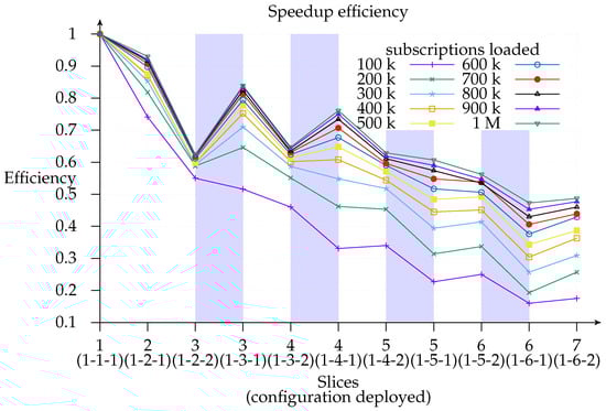 For clarity’s sake, Figure 10 shows the speedup for 1-x-2 deployments only, since, as shown in Figure 8 above, the 1-x-2 configuration always outperforms 1-x-1. However, the same does not apply with respect to efficiency, which is computed as a ratio of speedup to the number of instances (processors) used, that is, []. Figure 11 shows how efficiency decreases as the number of slices increases and the 1-x-1 configuration is more efficient than the 1-x-2 configuration in most cases and especially with deployments with not many instances. Additionally, this graph indicates the layer to which it is better to add a new slice since deployments with the same number of slices (highlighted regions) can be compared and a cost-benefit analysis of adding a second exit point (white regions) can be conducted. As a matter of fact, we find that the most efficient deployment for the three-slice region for all loads except 100 k is the configuration with only one exit point. This means that matcher requirements are greater than exit point utility. The same applies for the four-slice region, although the threshold is raised to a 400 k subscriptions load. This is consistent with expectations since the speedup contribution margin of each new added matcher will be smaller than its predecessor’s. This could be modeled in an open cloud using the Shapley value [,].