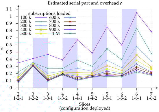 Finally, Figure 12 shows the estimated Karp–Flatt metric of configuration deployments, where s represents the speedup and p the number of slices (processors) used. This metric is used to estimate the serial part and the overhead from experimental data []. It is, therefore, a valuable metric for use in conjunction with efficiency, since it gives an insight into whether the decreased efficiency is due to the limits of parallelism or overhead. As we can see, we are experiencing network overhead with a 100 k load since adding more matchers increases the estimated e, especially with the 1-x-1 configuration. Looking at how the same deployment behaves with a larger subscriptions load, we find proof that the overhead is network related: the estimated e sinks to the 10–20% region.