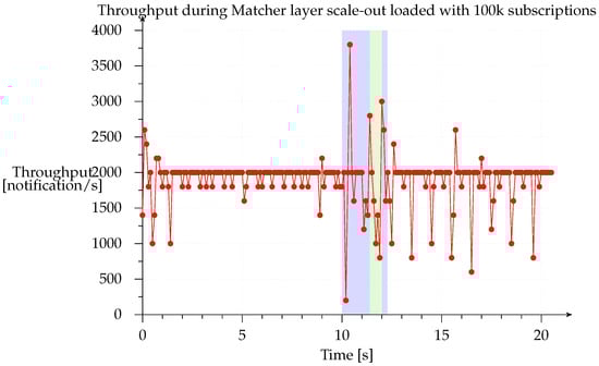 Figure 13 shows the scale-out from the 1-1-1 to the 1-3-1 configuration. The red line represents notification throughput received from the subscriber and the highlighted blue region represents the time during which the system was scaling out. Clearly, the system continues to process notifications while the subscriptions are buffered in the access points and matchers are switching to their new state, after which the access point starts buffering notifications and flushes all its buffered subscriptions (green region). This phase is illustrated in the graph from seconds 11.4 to 11.9 (490 ms). The matchers then have their new state updated so that they can reprocess the notifications. During the last phase (narrow orange band), which takes place from seconds 11.9 to 12.0 (98 ms), all notifications, buffered while sending the previously buffered subscriptions, are flushed. Obviously, since each matcher operates independently of the others, throughput is highly variable. The normal throughput of 2000 notifications/s is restored at the end of the scale-out, meaning that all internal buffers have been emptied.