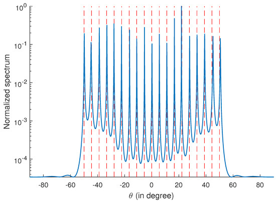 The consecutive range of the coarray is from to 17, indicating that the resolvable number of sources is 17 without filling the holes. In this subsection, we consider 19 uncorrelated sources which are uniformly distributed in . A SNR of 0 dB and 500 snapshots are used, and is set as 8. The spatial spectrum is depicted in Figure 1. It is obvious that the directions are correctly estimated, which verifies that the holes in the coarray are filled successfully.