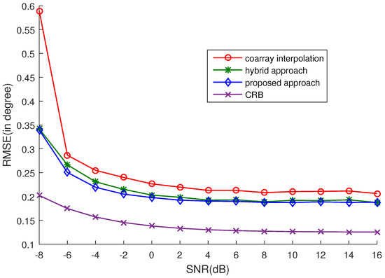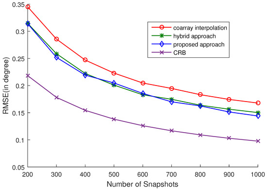 In this subsection, the RMSEs versus SNR and the number of snapshots are computed to further exploit the estimation performance of the proposed approach. 16 uncorrelated sources are considered. The RMSEs versus SNR and the number of snapshots are plotted in Figure 2 and Figure 3, respectively. Five hundred snapshots are used in Figure 2, and 0 dB SNR is set in Figure 3. The selection of is listed in Table 2 and Table 3, corresponding to Figure 2 and Figure 3, respectively. We can easily see that the proposed approach outperforms the other two approaches from the simulations. Although the hybrid approach can achieve a similar accuracy to the proposed approach, the computational complexity of the proposed approach is much lower than that of the hybrid approach. The reason is that two nuclear norm minimization problems need to be optimized in the hybrid approach, while only one nuclear norm minimization problem is optimized in the proposed approach. Experimentally, under the same conditions, it takes 102.0889 s to run 50 trials for the hybrid approach and 75.5295 s for the proposed approach. Note that as analyzed in [16], the estimation accuracy of coarray-based MUSIC cannot attain the CRB when there are more sources than physical sensors. So, there is a gap between the RMSE and the CRB.