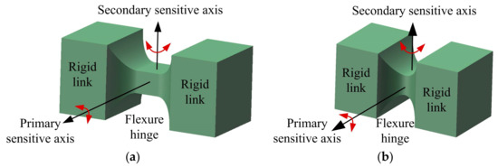 Flexure hinges can utilize their slender portions to produce relative motion between two adjacent rigid links in flexure-based compliant mechanism. In many high precision and micro-operation applications such as micro/nano-positioning platforms [1,2,3], displacement amplifiers [4,5,6,7], sensors [8,9,10], elliptical-vibration texturing device [11], micro-grippers, bionics, and micro-electromechanical systems [12,13,14,15], flexure hinges also play a very important role as alternative solutions to traditional rigid joints due to their positive features of not requiring assembly, compactness, zero friction and high resolution, etc.