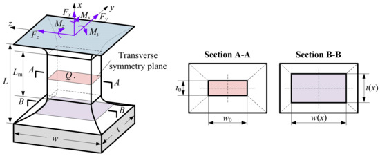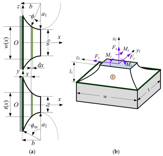 The geometric parameters and cutout profiles of the flexure segment 4 are sketched in Figure 7. Some identical parameters defined in Figure 6 can apply to the Figure 7. As shown in Figure 7a, the width w(x) in plane xz and the thickness t(x) in plane xy of the infinitesimal strip dx at position x can be expressed as: