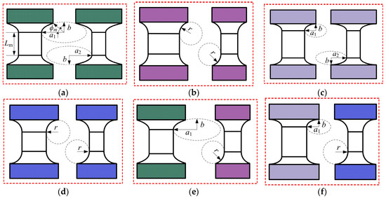 A two-axis corner-filleted flexure hinge whose two adjacent cutout profiles are introduced and defined by two non-identical elliptical-arc-filleted, respectively, as figured in Figure 3a, where a1 and a2 indicate the major semi-axis of ellipse, b and r represent the minor semi-axis of ellipse and the radius of circle, respectively, φm (0 < φm < π/2) is the maximum semi-eccentric angle. Chen et al. [35] gave the relationships among circular, right-circular, elliptical and elliptical-arc, and the former three are subsets of the latter one. Hence, the two-axis elliptical-arc-filleted flexure hinge defined by dual elliptical-arc-filleted cutout profiles as one of the most common two-axis corner-filleted flexure hinges can be translated into other two-axis corner-filleted flexure hinges in terms of the relationships among a1, a2, b and r and the value of φm. Figure 3b–f illustrate five two-axis corner-filleted flexure hinges, whose two different cutout profiles are defined by dual circular-arc-filleted, dual elliptical-filleted, dual right-circular-filleted, hybrid elliptical-arc-filleted and circular-arc-filleted, hybrid elliptical-filleted and right-circular-filleted, respectively. Similarly, when Lm = 0, all these two-axis corner-filleted flexure hinges above will degenerate into other six general two-axis flexure hinges.