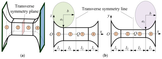 A generic two-axis elliptical-arc-filleted flexure hinge with a transverse symmetry plane is shown in Figure 4a, which can be divided into four segments in terms of the cutout geometric profiles. The segments 1 and 4 are the left half-segment and right half-segment two-axis flexure hinges with elliptical-arc notches, respectively, the segments 2 and 3 are both identical constant rectangular cross-section beams. Figure 4b shows the geometric parameters, the vertical and horizontal cutout profiles through the initial center of rotation Q, where l1 is the length of the segments 1 and 4, and l2 is the length of the segments 2 and 3.