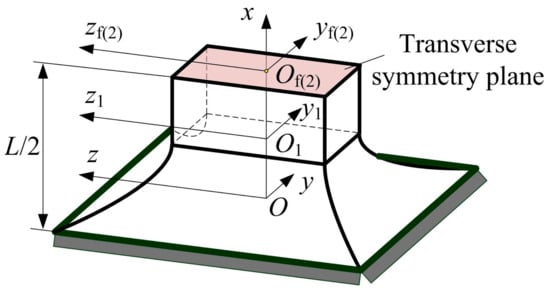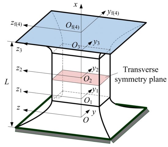 The FEA model of a flexure hinge includes the rigid links of both ends of the hinge besides the flexure hinge [18,19,20,21], namely the theoretical fixed end of the hinge will change and induce deformation in FEA model under the action of external load, and the FEA results of the hinge are that the rotations or deformations caused by the left-end section of the hinge were subtracted from the corresponding rotations or deformations caused by the right-end section of the hinge [25], thus there are different from the analytical model on the constraint conditions—see Figure 5 and the compliance calculations. Meanwhile, the point load is applied on a node or a test point [24,25], which is different from the actual applications of the hinge on the loading conditions. To overcome the above problems, an analytical model of two-axis elliptical-arc-filleted flexure hinge in accordance with the FEA model is proposed, and its geometric relationships among coordinate frames are shown in Figure 9, where the O-xyz and Of-xyfzf are the global frame and the local frame established in the fixed end and the free end of the analytical model, respectively, the Ol-xylzl, Oh-xyhzh and Ou-xyuzu are the local frames established in the tips of lower rigid link, flexure hinge and upper rigid link, respectively, and l0 is the length of the rigid link.