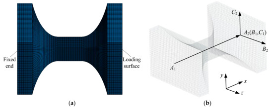 The finite element mesh models of two-axis corner-filleted flexure hinges with two rigid links were generated by using twenty-node, three-dimensional hexahedral elements (Solid 186) with three translational degrees of freedom per-node, one of the hinge mesh models is shown in Figure 10a, of which its total nodes and total elements are 195,716 and 45,696, respectively. Meanwhile, the mesh-independent validation is carried out to eliminate the effect of mesh densities on the computational accuracy and reduce the calculation time. The one and the opposite end of each hinge model are fixed and loaded, respectively. In order to obtain or calculate better the compliance elements in FEA results, three different paths in finite element model are defined, as depicted in Figure 10b, where the A1-A2 is path 1, the B1-B2 is path 2, the C1-C2 is path 3, and A1-A2, B1-B2 and C1-C2 are parallel to x-, z- and y-axis, respectively, A2, B1 and C1 three points coincide, A1 and A2 are located on the geometric center of the fixed end and the loading surface, respectively, B2 and C2 are located on both sidelines of the loading surface, respectively, of which the output displacement of point A2 along the corresponding axis produced by unit force fx, fy or fz is used for obtaining the element CAn,11, CAn,22, or CAn,33; the output displacements of point B2 along x-axis and point A2 along z-axis under unit moment My are used for calculating the element CAn,55 and obtaining the element CAn,35, respectively; similarly, the output displacements of point C2 along x-axis and point A2 along y-axis under unit moment Mz are used for calculating the element CAn,66 and obtaining the element CAn,26, respectively; the output displacement of point B2 along y-axis or point C2 along z-axis under unit moment Mx is used for calculating the element CAn,44. Six different two-axis corner-filleted flexure designs with two rigid links defined in Figure 3 are selected as the compliance comparisons between the analytical results and the finite element results. The geometric parameters of each model are listed in Table 1. For all design types, the linear elastic material properties are: the elastic modulus E = 2.0 × 1011 N/m2, Poisson’s ratio v = 0.3, the shear modulus G = 7.6923 × 1010 N/m2, and the density ρ = 8000 kg/m3. Notice, however, that only two-axis flexure hinges in small deformation are considered due to the stress concentration that occurs on the minimum cross section of the hinges, thus the static analysis with linear geometry setting is performed in the finite element model, which is different from the large deformation with non-linear geometry setting of the constant cross-section beams that are introduced by the material nonlinearity or the geometry nonlinearity [44,45], this is because the stress distributes uniformly on the constant cross-section beam. In addition, the nonlinear and the linear geometry settings in the finite element model of the hinges can get the same results in small deformation. Meanwhile, the analytical model is restricted to linear elastic materials and only applied to small deformation occasions.