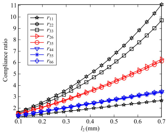 Figure 11 shows the variation of eight compliance ratios in terms of l2, the other geometric parameters listed in Table 1 except l0 = 0 and the material properties are all constant. According to the linear superposition principle, the compliance ratios r11, r44, r55, and r66 depend linearly on the length l2 and increase slowly. However, for the ratios r22, r33, r26 and r35, they depend non-linearly on the length l2, and the increased amplitude of r22 or r33 are more than r26 or r35. Meanwhile, it can be observed that the two-axis corner-filleted flexure hinges have higher capacity of rotation than two-axis flexure hinges when l2 is relatively large.