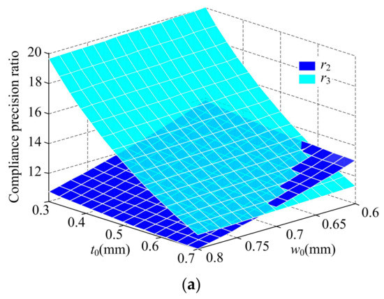 The larger compliance and precision ratios show that the flexure hinges have better ability and smaller relative motion error. Similarly, the two-axis elliptical-arc-filleted flexure hinge and its analytical compliance and precision equations are utilized to further investigate the effect of geometric parameters on the compliance precision ratio, all parameters listed in Table 1 except the corresponding variations and l0 = 0 keep constant. Figure 12 illustrates these trends that four compliance precision ratios of DEAF vary with the parameters w0 and t0, and Figure 13 illustrates the results of the compliance precision ratios as a function of l2.