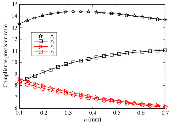 The compliance precision ratios from r2 to r5 depend non-linearly on the parameter l2, as shown in Figure 13. The ability of preserving the rotational center under pure moment My or Mz decreases whereas the ability under pure force fz increases with increasing l2; but the ratio r2 increases firstly and then decreases slowly and can be achieved larger compliance precision ratio with respect to the other three; the ratio r3 is also larger than r4 and r5 as l2 increases, which show that the ability of preserving the rotational center under force is larger than the one under moment when the free end of two-axis elliptical-arc-filleted flexure hinge has same displacement and l2 is gradually larger.