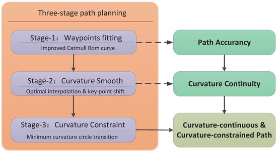 To deal with problems involving planning, a three-stage path planning algorithm with a transition selection mechanism for piecewise paths is proposed in this paper. The operational workflow of this algorithm is presented in Figure 1.