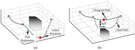 In fact, the obstacle avoidance mechanism in Figure 2 is to navigate around obstacles by designing a path via path re-planning. By adding or moving a waypoint, the predefined path is locally changed. This path re-planning helps to solve the obstacle avoidance problem at the path level.
