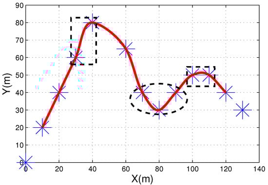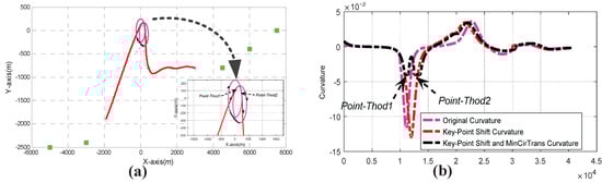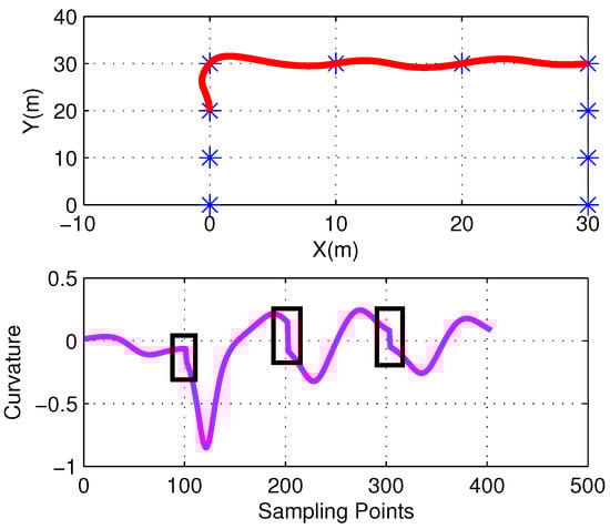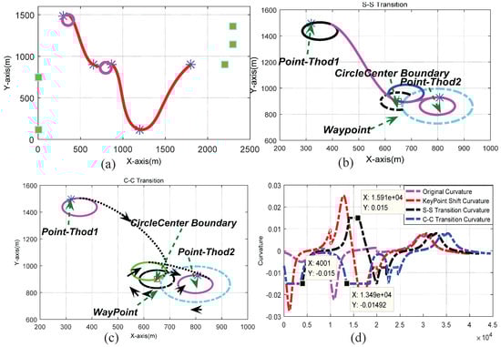 For predefined waypoints, curvature discontinuities may exist at junction points, as shown in Figure 3. Further investigation indicates that the shape parameters and positions of the corresponding waypoints are the decisive factors in determining the degree of discontinuity. For simplicity’s sake, we set the shape parameters as follows: and . It should be noted that although the results in Equation (9) would change when the parameters are different, the curvature smoothing algorithm proposed still holds.